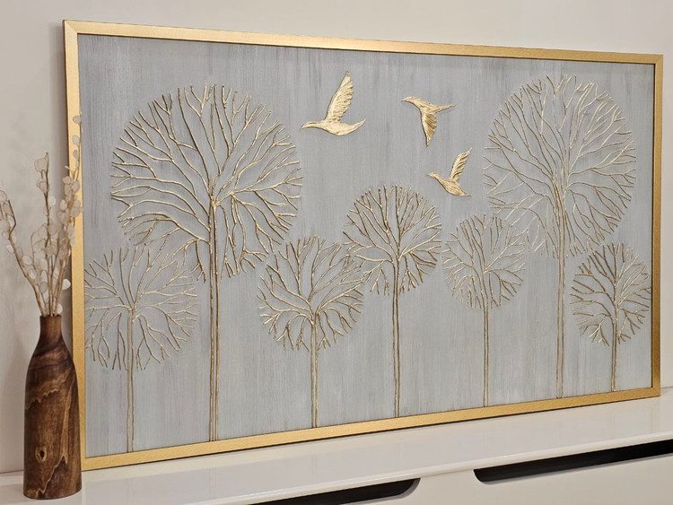 بافت سهبعدی گل،های قاصدک و پرندههای طلایی ترکیبی چشمنواز و لوکس را به بیننده منتقل میکند.