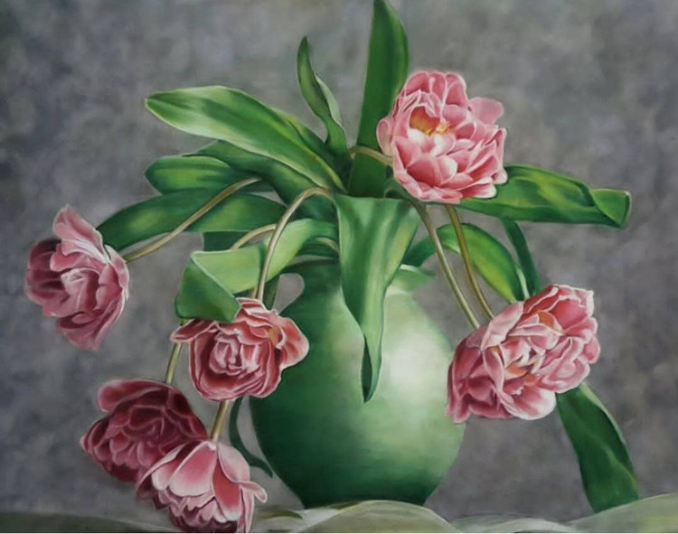 در این اثر گلدانی سبز با گلهای پیونی صورتی درخشنده، در مرکز ترکیب قرار گرفته است. بافت نرم و مخملی پاستلها، لطافت گلبرگها را چون نسیمی در دل تابلو جاری کرده است. زمینهای آبرومند و ابروبادی به رنگ طوسی، آرامش و سکوتی ظریف به فضای اثر بخشیده تا شکوه رنگهای صورتی و سبز بیشتر بدرخشند. هر ضربهی پاستل، یادآور لحظهای زنده از طبیعت است؛ لحظهای کوتاه اما سرشار از زیبایی.