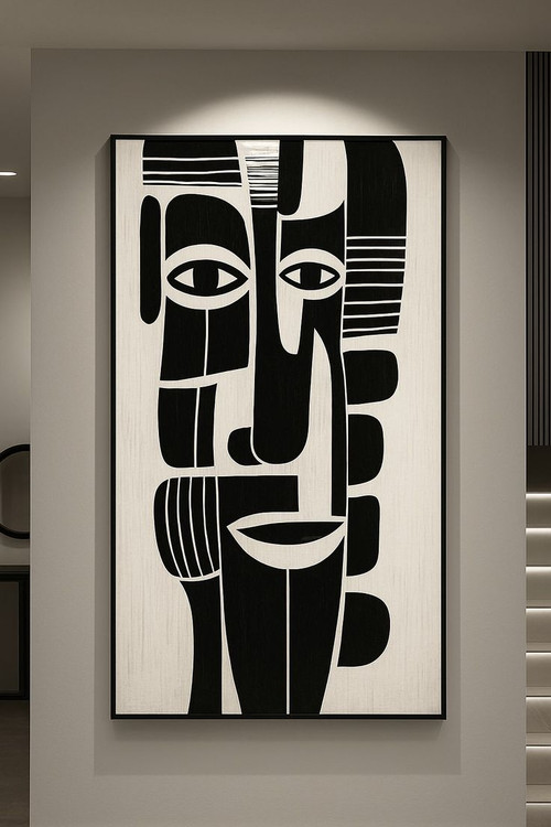 این تابلوی چهره مینیمال با ترکیب فرمهای هندسی و تضاد قدرتمند سیاه و سفید،نگاهی مدرن به چهرهی انسان ارائه میدهد.