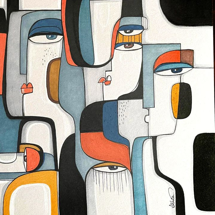 تابلوی چهرهها با ترکیب فرمهای هندسی و رنگهای متعادل،روایتگر تنوع احساسات و نگاههای انسانی است.